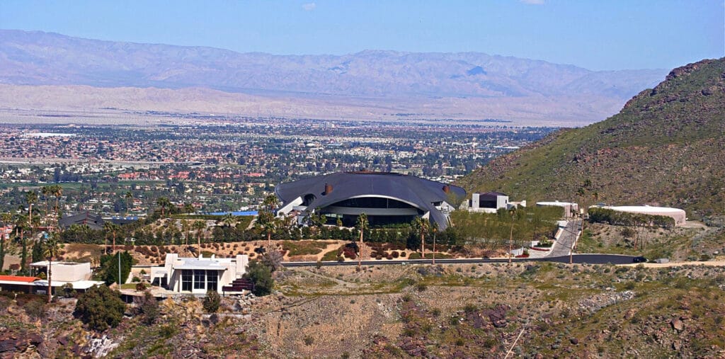 W oddalonych górach błyszczy prawdziwa perełka – najbardziej spektakularny dom należący do komedianta Boba Hope’a. Ten futurystyczny pałac wygląda jakby miał zaraz odlecieć w kosmos, ale spokojnie, jeszcze tu jest! Mieści się w zamkniętej dzielnicy Southridge, więc nie licz na spontaniczne odwiedziny, nie martw się – ten dom jest tak wielki i imponujący, że można go podziwiać praktycznie z każdego kąta w Palm Springs. Serio, nawet palmy patrzą na niego z zazdrością!